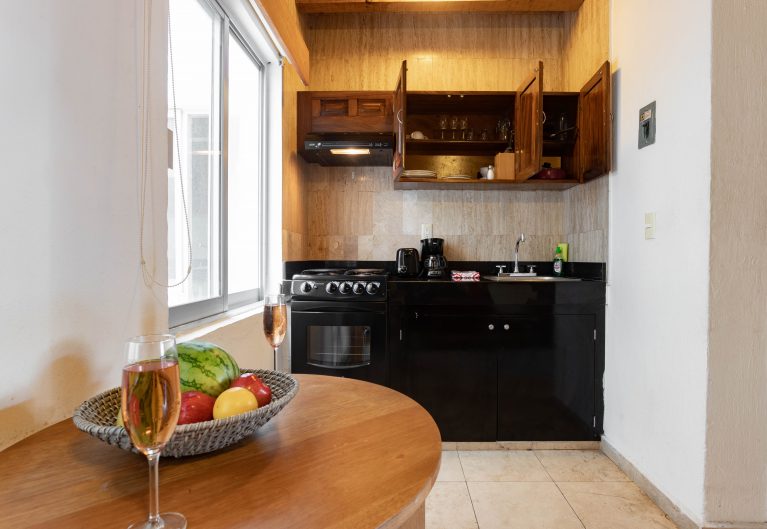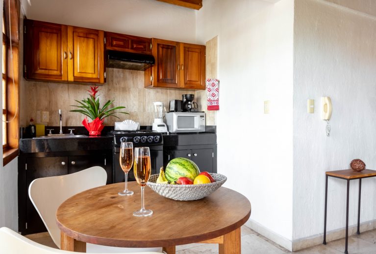 Cama King Size con cubre colchón Memory Foam Premium, sábanas de alta calidad y baño con regadera. Nuestras suites más populares ofrecen un área designada sobre el pasillo con vista a la encantadora Zona Romántica de Puerto Vallarta, ideal para sentarte a leer un libro o disfrutar de un delicioso desayuno al aire libre.